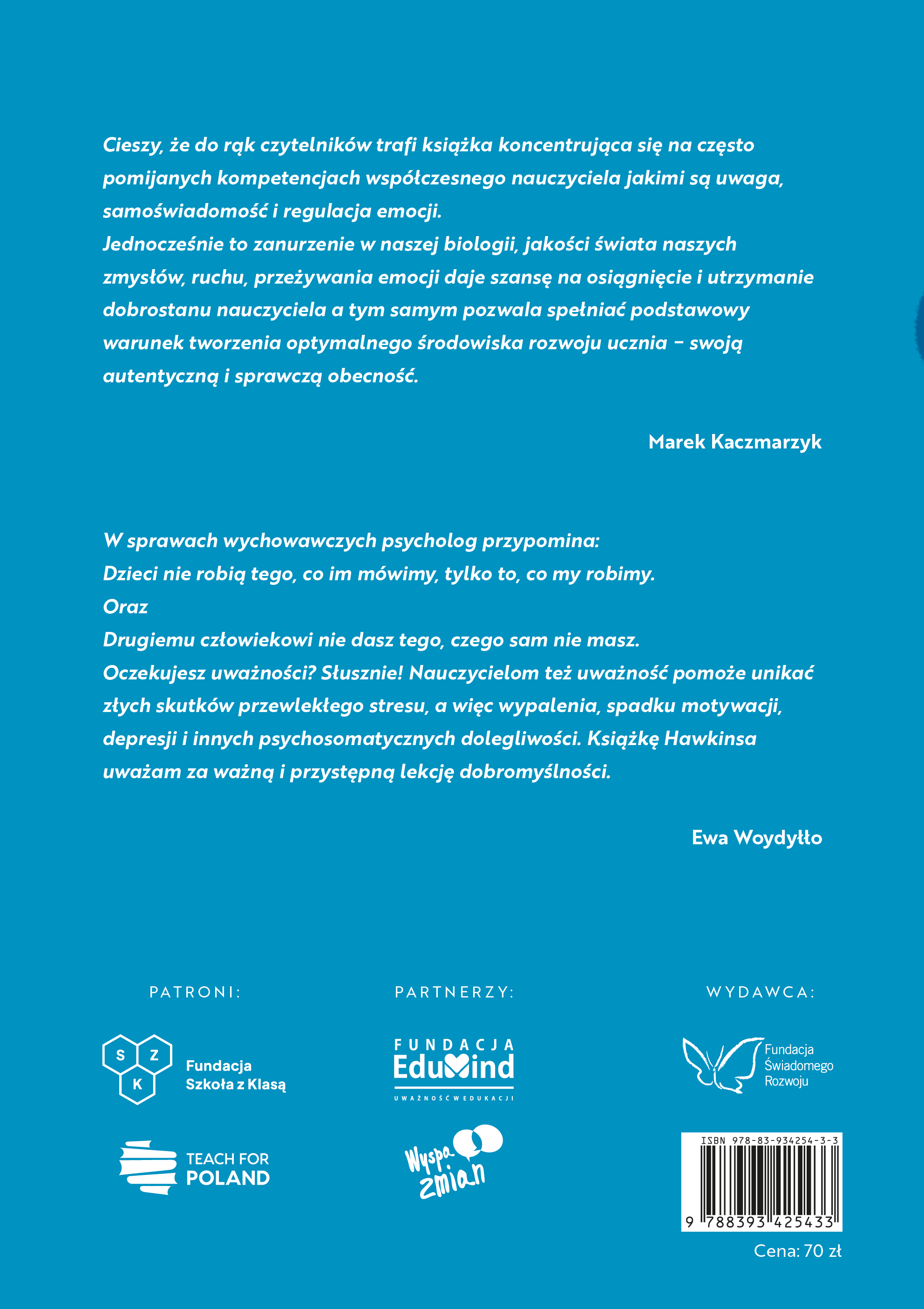 Oczekujesz uważności? Słusznie! Nauczycielom też uważność pomoże unikać złych skutków przewlekłego stresu, a więc wypalenia, spadku motywacji, depresji i innych psychosomatycznych dolegliwości. Książkę Hawkinsa uważam za ważną i przystępną lekcję dobromyślności.”
